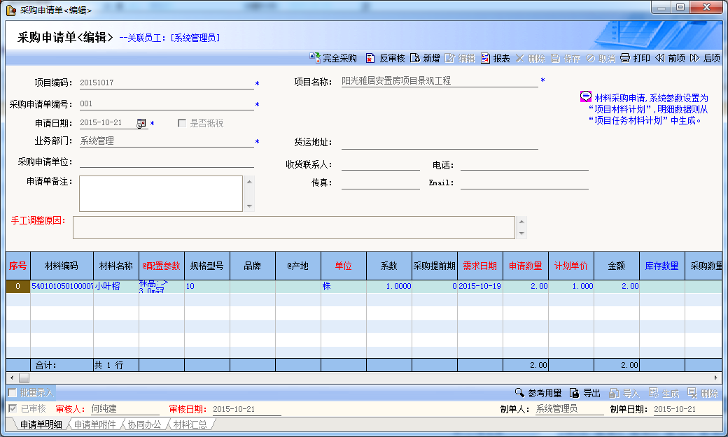 - 建立了一套完整的供應鏈管理。不論是項目上需要用的材料設備,還是項目工地日常使用的生活用品,還有種植苗木的采購,都可以通過PM2項目管理系統(tǒng)進行有效的管理。先由成控部做每個項目的整體材料預算;然后由項目部人員做分項材料計劃,向采購部提采購申請單;采購部人員依據(jù)項目部人員所提的采購申請單安排采購事宜,簽訂采購合同,給供應商下采購訂單。供應商貨到后,安排驗貨及到貨材料入庫,后續(xù)給供應商結算和付款等一系列業(yè)務。
