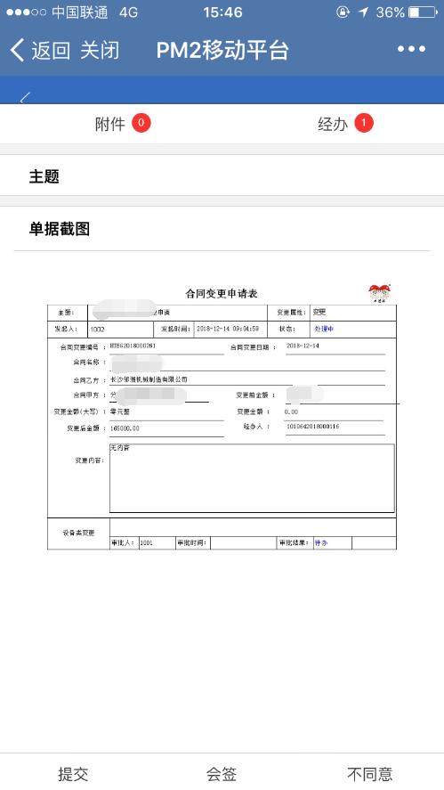 在“我的審批”圖標(biāo)上角標(biāo)顯示當(dāng)前用戶(hù)最新收到的審批事項(xiàng)的個(gè)數(shù),點(diǎn)擊進(jìn)入后顯示審批事項(xiàng)的列表,包括審批文件的名稱(chēng)、發(fā)起人、發(fā)起日期、上個(gè)步驟的審批人和審批時(shí)間等信息,點(diǎn)擊具體事項(xiàng)可查看業(yè)務(wù)明細(xì)并進(jìn)行會(huì)簽審批。