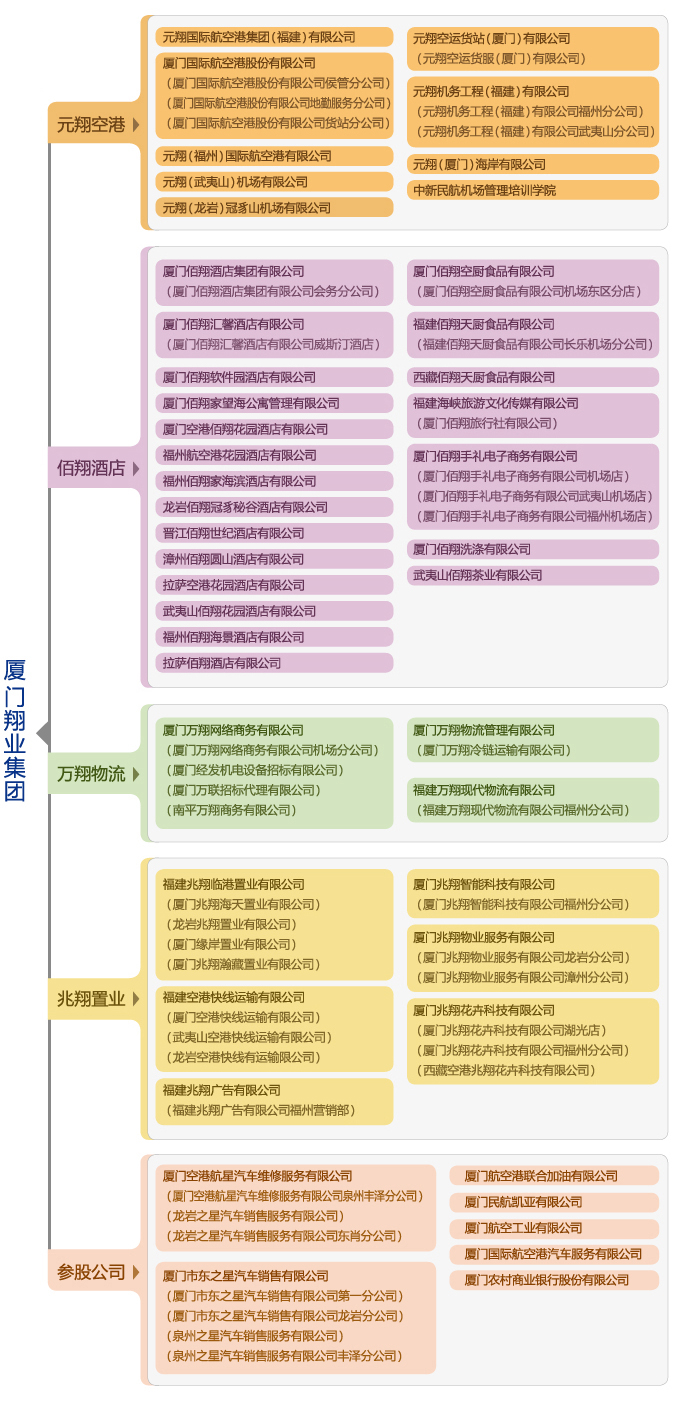 廈門(mén)翔業(yè)集團(tuán)是一家跨地域、多元化發(fā)展的大型國(guó)有企業(yè)集團(tuán),擁有全資或控股下屬公司40余家,產(chǎn)業(yè)覆蓋機(jī)場(chǎng)、碼頭、城際客運(yùn)、酒店、會(huì)展、電子商務(wù)、物流服務(wù)、臨港商業(yè)地產(chǎn)、食品、廣告?zhèn)髅健⒅悄芸萍、花卉科技等領(lǐng)域,是中國(guó)服務(wù)業(yè)500強(qiáng)企業(yè)之一。