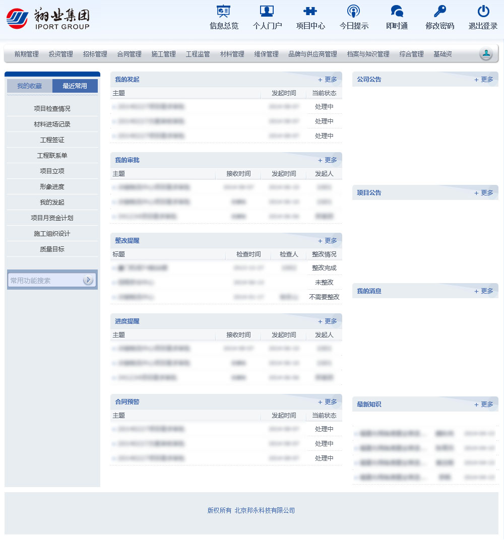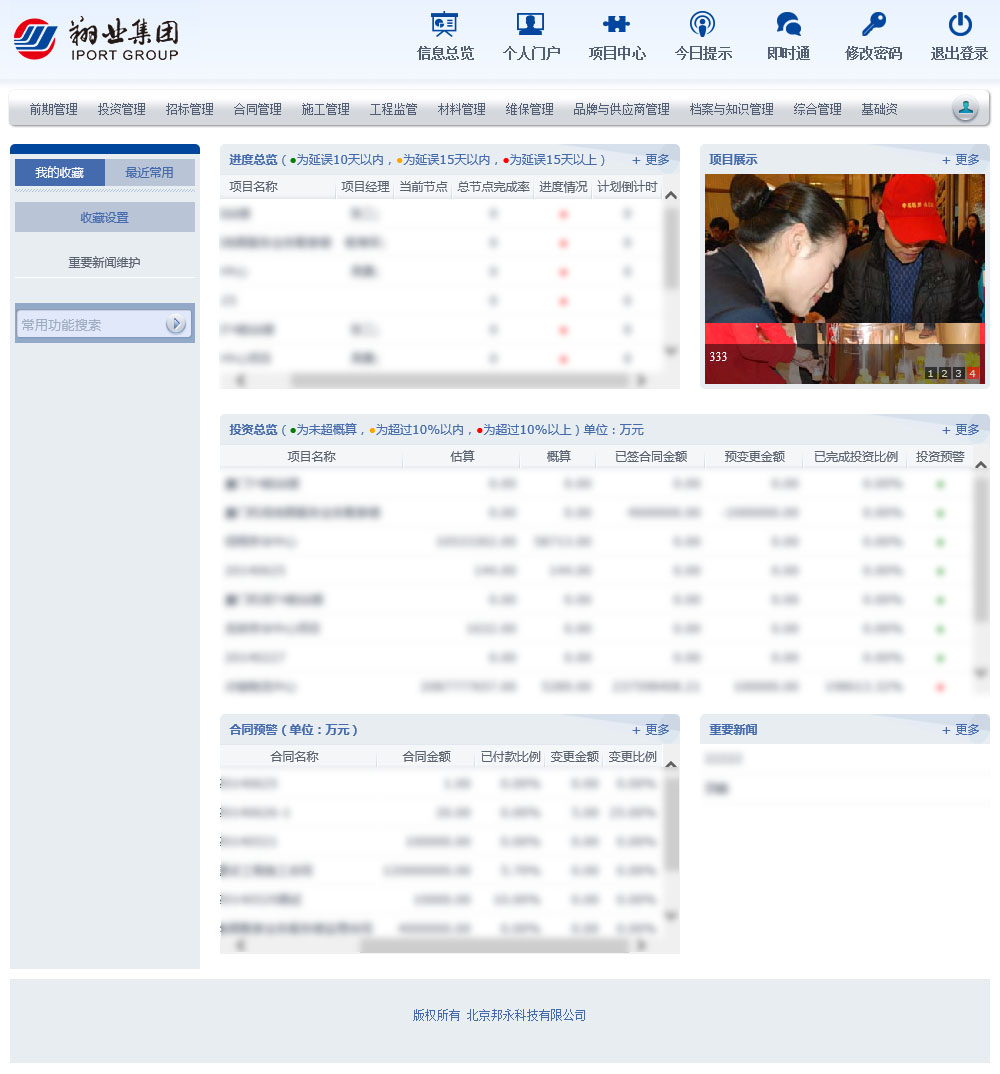 系統(tǒng)通過(guò)信息總覽、項(xiàng)目信息中心、前期管理、投資管理、招標(biāo)管理、合同管理、施工管理、工程監(jiān)管、材料管理、維保管理、品牌與供應(yīng)商管理、檔案與知識(shí)管理、綜合管理、系統(tǒng)基礎(chǔ)設(shè)置等一系列功能來(lái)實(shí)現(xiàn)業(yè)務(wù)需求。