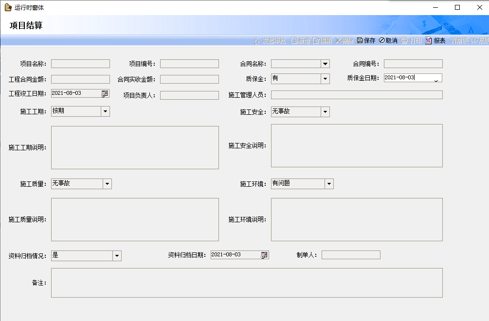 1、通過調(diào)研業(yè)務(wù),針對工程施工類項(xiàng)目,在系統(tǒng)內(nèi)設(shè)置了合同交底書、工程任務(wù)單、工程項(xiàng)目要求評審表、施工方案審核表、施工組織方案、施工策劃表、項(xiàng)目流程進(jìn)度監(jiān)控表等一整套管控節(jié)點(diǎn),明確了部門的責(zé)任與分工,實(shí)現(xiàn)了項(xiàng)目全流程各環(huán)節(jié)的監(jiān)管。