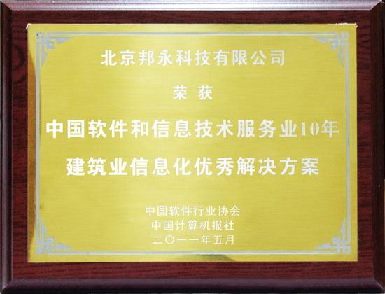 熱烈慶祝邦永科技榮獲“中國軟件和信息技術(shù)服務(wù)業(yè)10年建筑行業(yè)信息化優(yōu)秀解決方案”獎