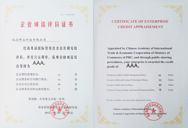 此次北京邦永科技有限公司“AAA”企業(yè)誠信評價證書的取得,是商務(wù)部國際貿(mào)易經(jīng)濟(jì)合作研究院對我司誠實守信、客戶至上經(jīng)營理念的充分肯定。同時,我司也將不負(fù)厚望,不斷努力創(chuàng)新,為廣大客戶提供更加優(yōu)質(zhì)的產(chǎn)品與服務(wù),樹立重質(zhì)量、守信用企業(yè)的良好形象。