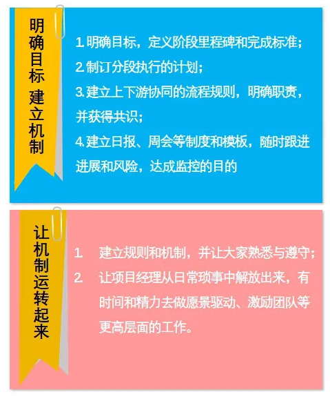 項(xiàng)目經(jīng)理最該做的,不是每天逐個(gè)人、逐條事項(xiàng)進(jìn)行監(jiān)督,而是要明確目標(biāo),建立機(jī)制,并讓這個(gè)機(jī)制運(yùn)轉(zhuǎn)起來(lái),最終在團(tuán)隊(duì)中形成一種良性的秩序