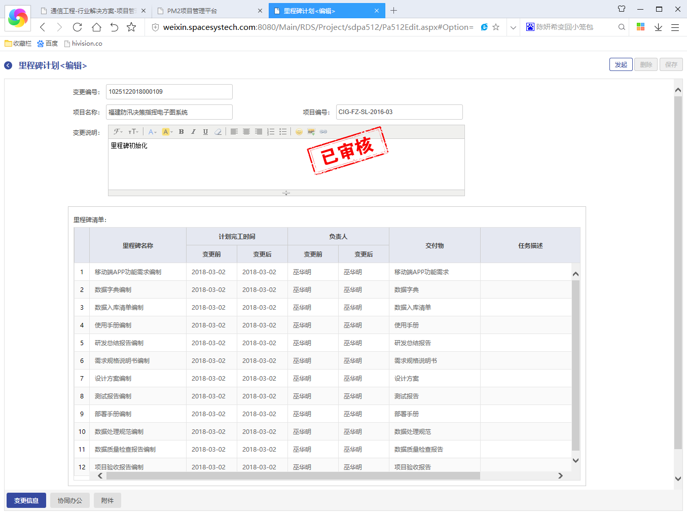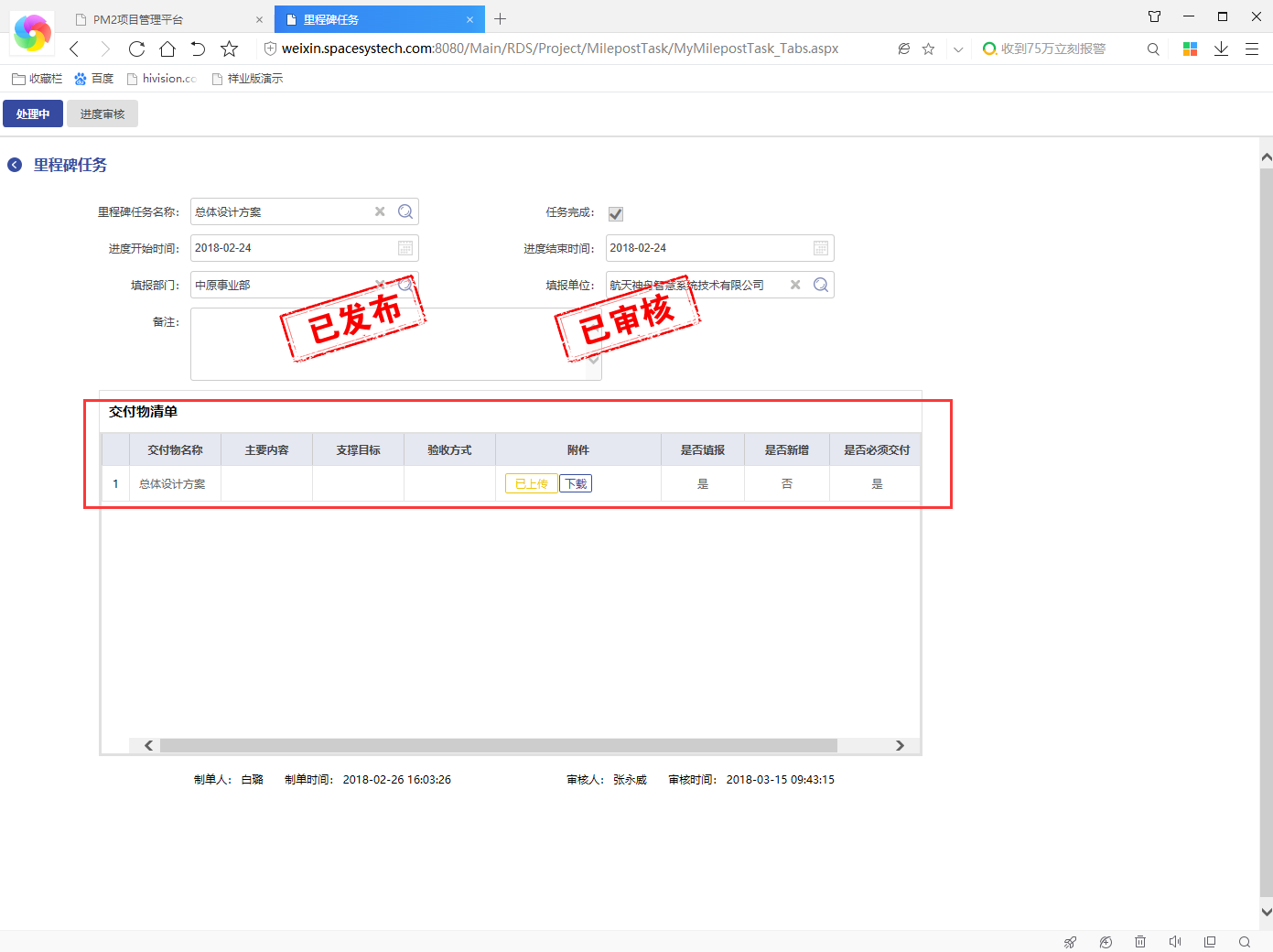 項(xiàng)目進(jìn)度管理面向管理層有宏觀的里程碑進(jìn)度分析,面向執(zhí)行層有可執(zhí)行的最小工作包,兼具不同角色需求產(chǎn)生不同的項(xiàng)目進(jìn)度分析結(jié)果。每一個(gè)里程碑、任務(wù)都可以設(shè)置一個(gè)或多個(gè)交付成果,當(dāng)交付成果為必須上傳時(shí),里程碑、任務(wù)上報(bào)時(shí)必須上傳否則無(wú)法上報(bào)。