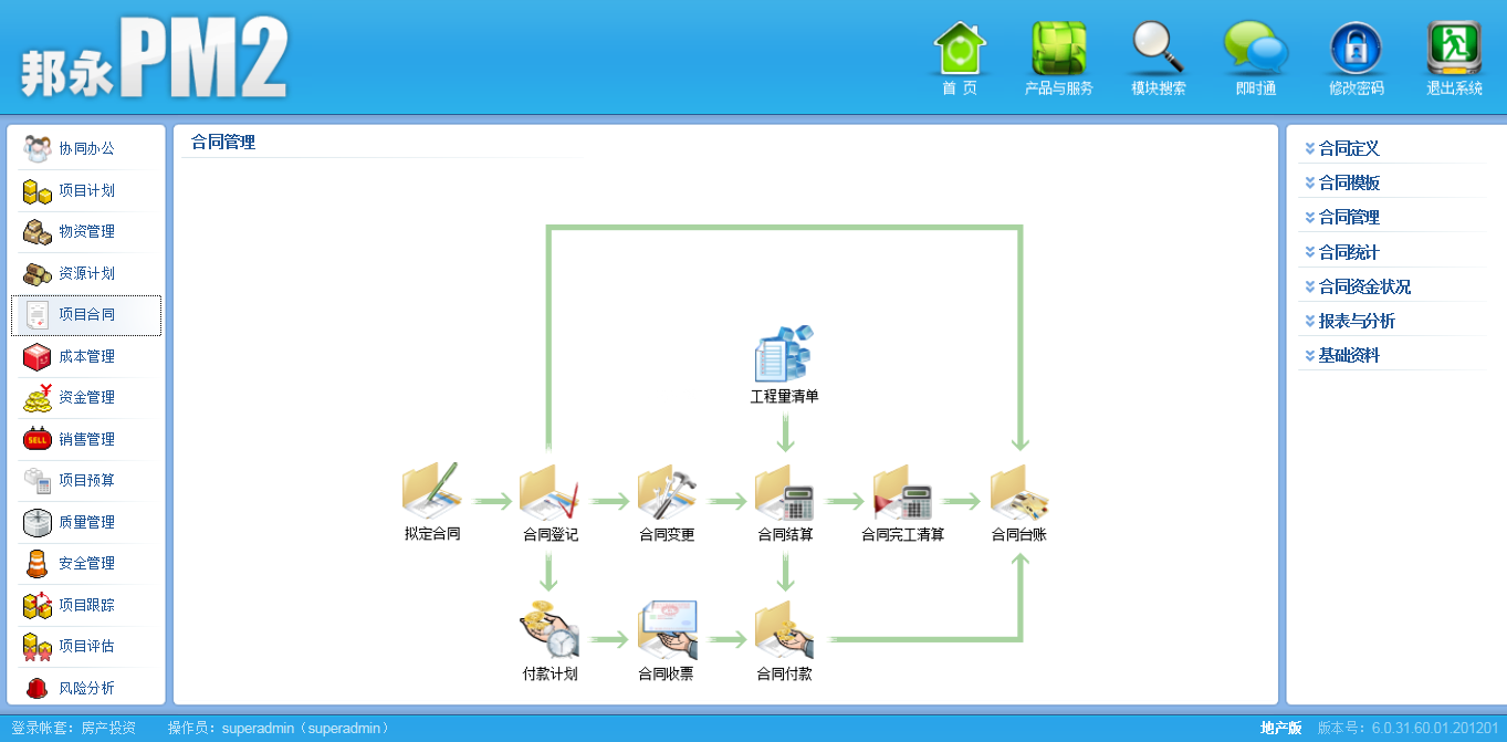 邦永PM2合同管理軟件能夠與邦永PM2系列產(chǎn)品的其他功能模塊(如:協(xié)同辦公、資金管理、物資管理、成本核算等)實(shí)現(xiàn)無縫對接,客戶在需要擴(kuò)大自身系統(tǒng)的管理范圍時(shí)能任意擴(kuò)展軟件功能模塊。