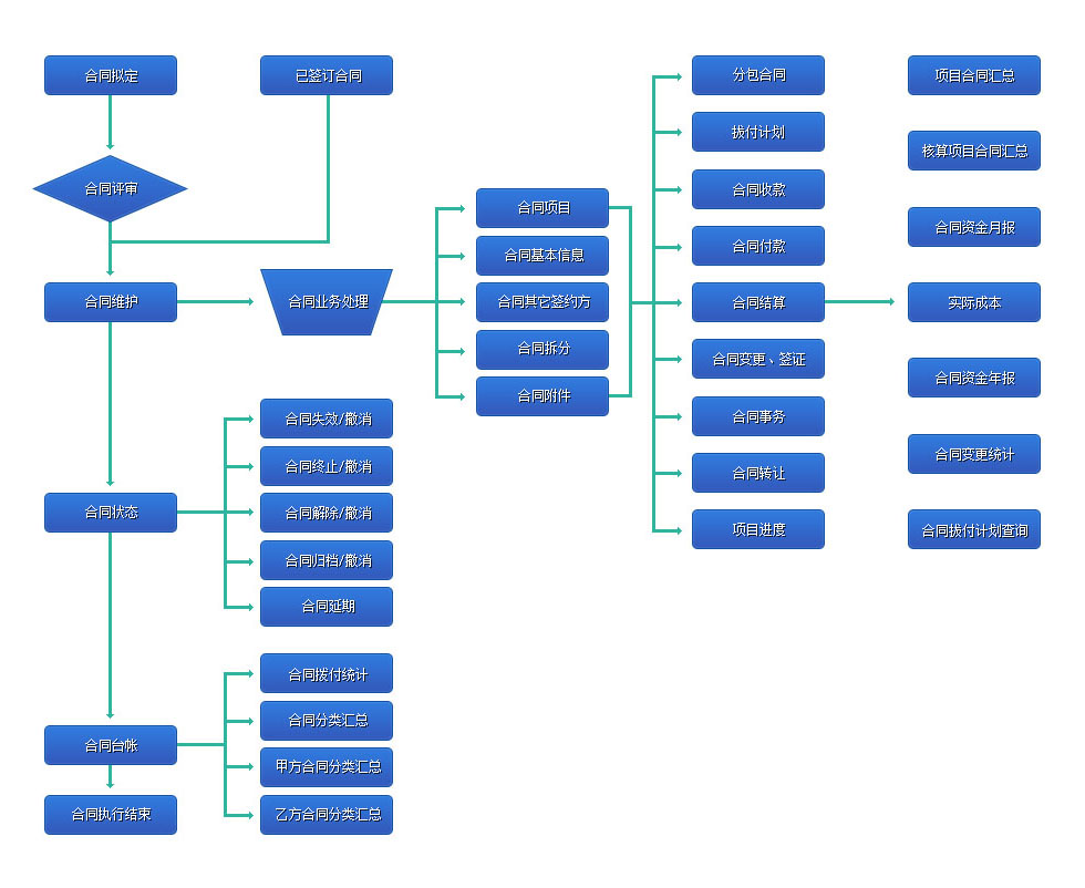 合同執(zhí)行過程中,軟件還提供了合同事務(wù)管理、合同發(fā)票登記、合同終止、合同解除等操作。