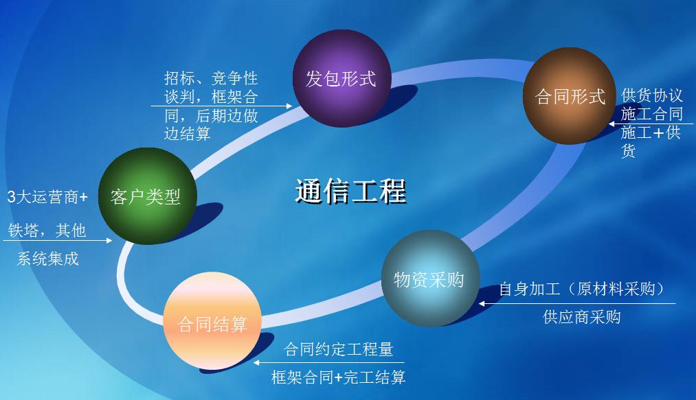 通信工程:從運(yùn)營商派單、訂立框架合同,到派工施工隊(duì),按站點(diǎn)施工,向運(yùn)營商收款,給施工隊(duì)結(jié)算付款全過程的管理。