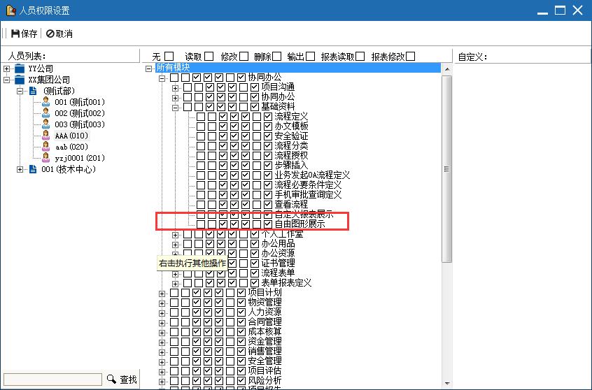 當(dāng)設(shè)計(jì)好自由報(bào)表并且保存生效發(fā)布后,通過(guò)模塊授權(quán),對(duì)該菜單進(jìn)行授權(quán),授權(quán)后,用戶才可見(jiàn)該模塊。