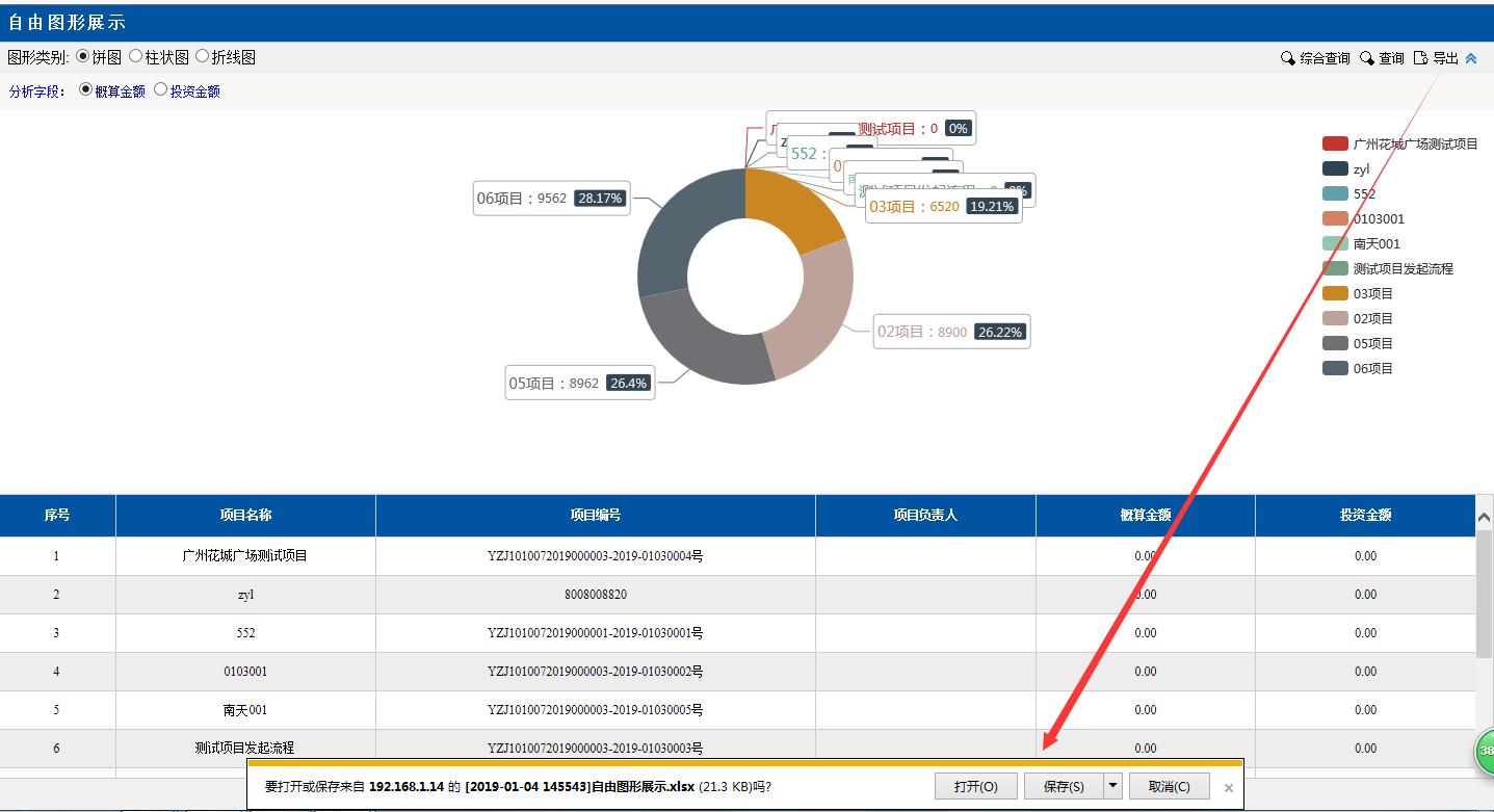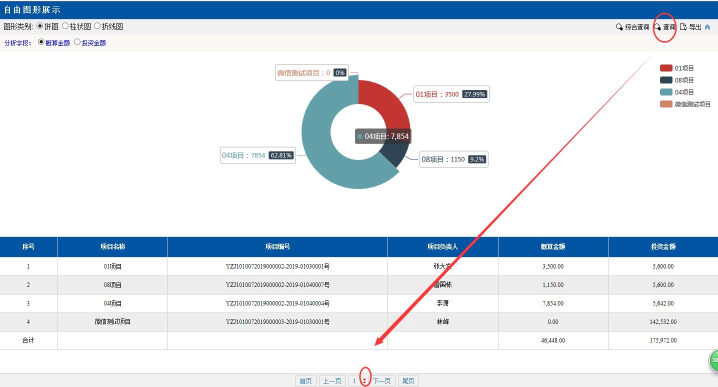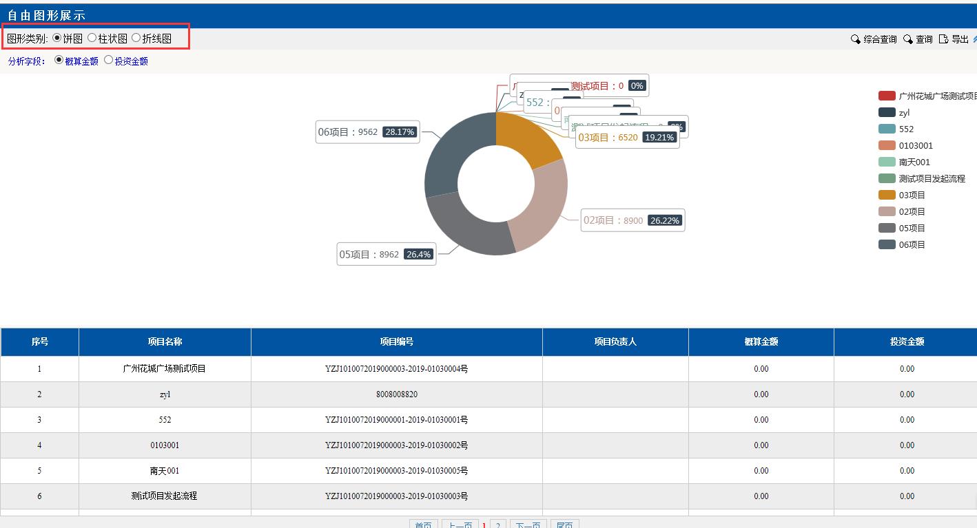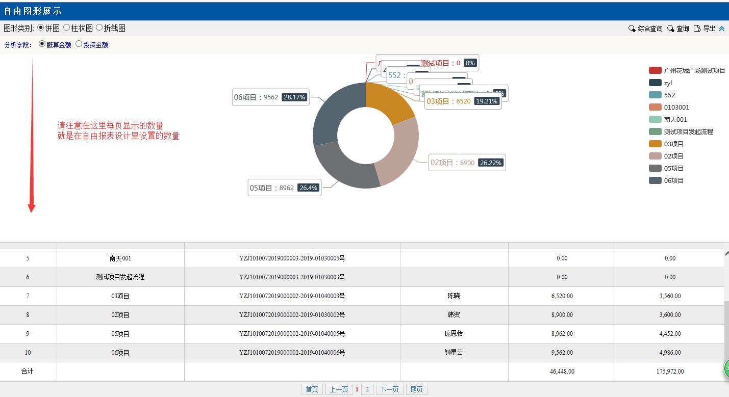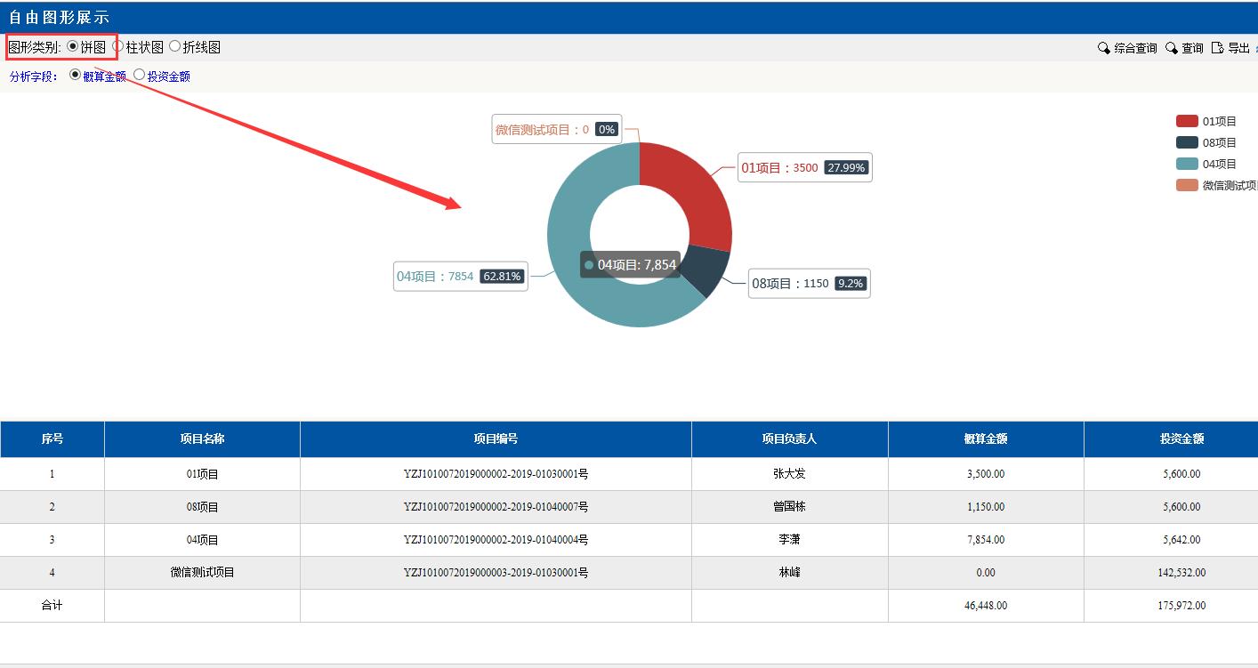 圖形類別點(diǎn)擊:餅圖。餅圖里的分項(xiàng)目,金額等對(duì)應(yīng)下面分頁(yè)的數(shù)據(jù),匯總分析占總金額的百分比,點(diǎn)擊項(xiàng)目前面的顏色按鈕變?yōu)榛疑珷顟B(tài),該項(xiàng)目就不會(huì)在左邊餅圖里顯示了。