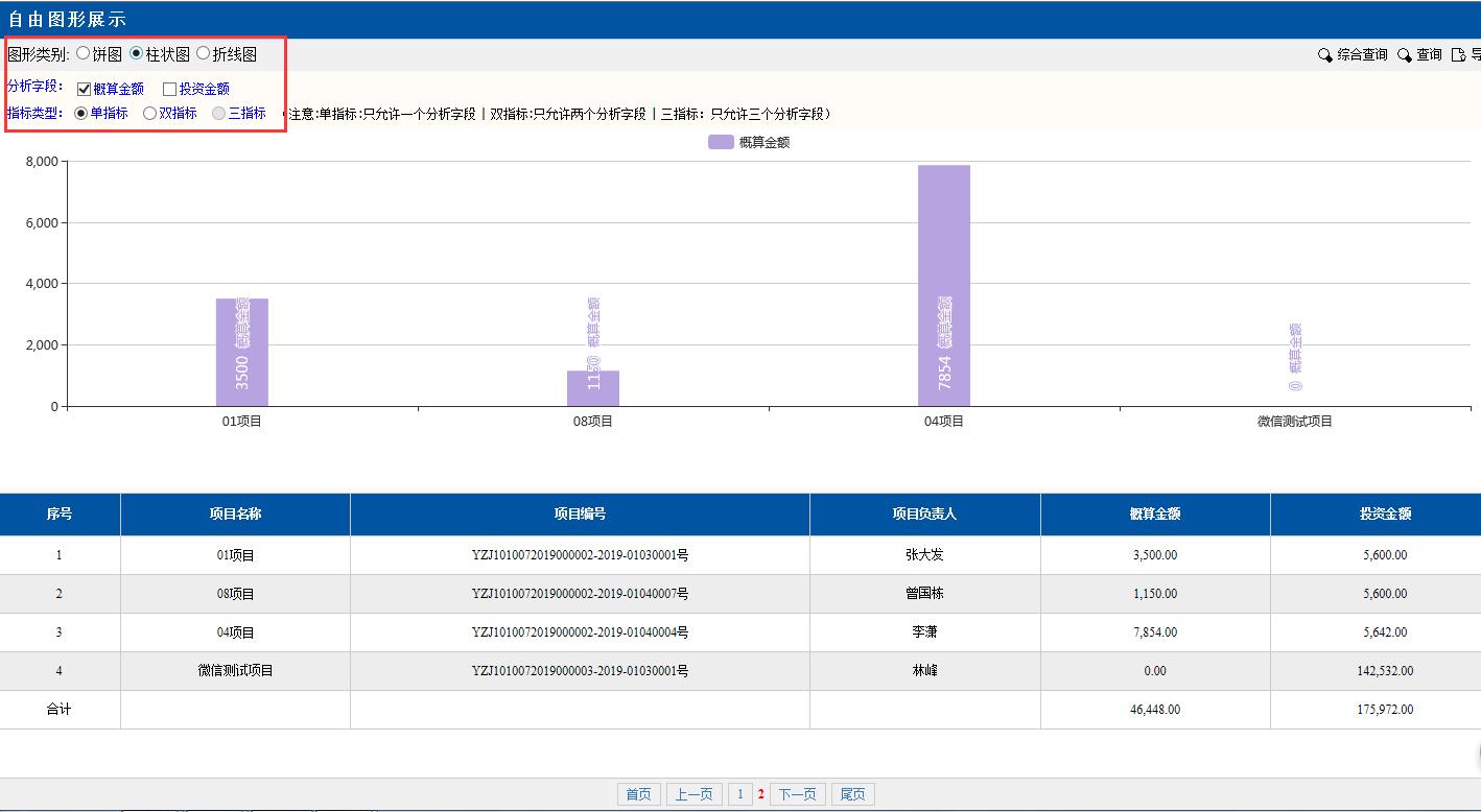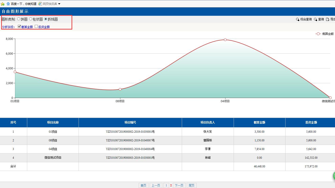 圖形類別點(diǎn)擊:折線圖。折線圖里的項(xiàng)目,金額等對(duì)應(yīng)下面分頁(yè)的數(shù)據(jù),可以很容易顯示每個(gè)項(xiàng)目金額的差額變化