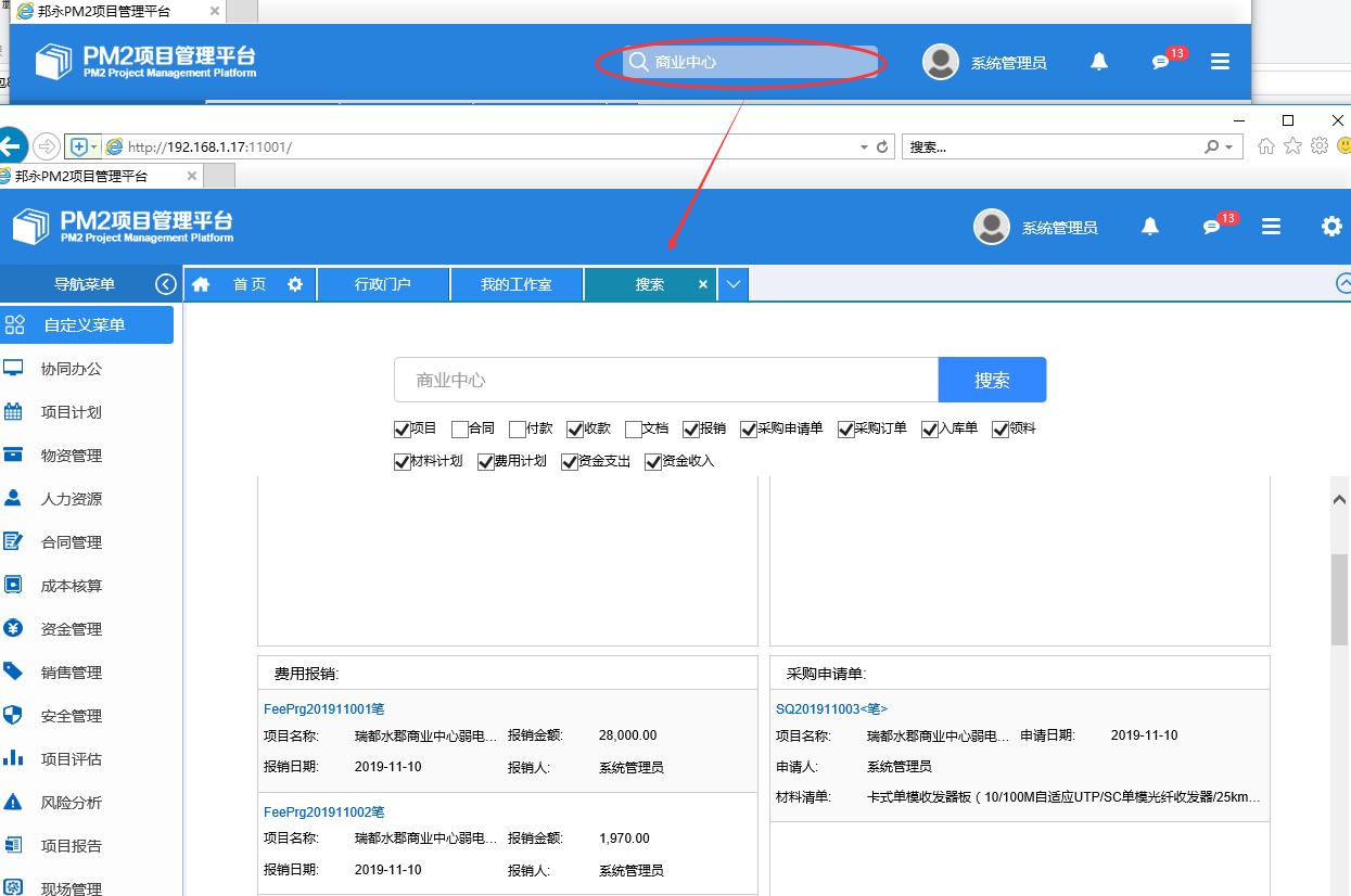 首页增加“搜索功能”,输入关键词,点击回R?x)进入到搜?ch)界面Q会(x)昄相关的项目、合同、收ƾ、文、报销、订单等信息?/p>
