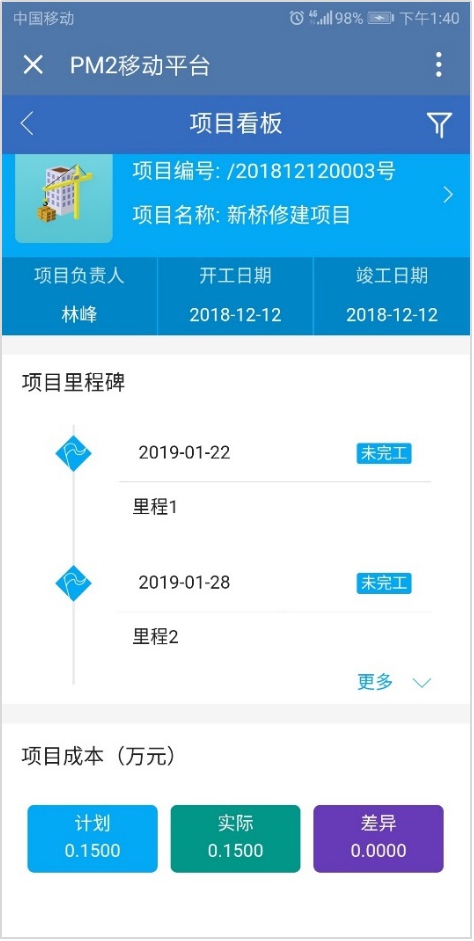 可以q入查看该项目的负责人,开工竣工日期、里E碑、项目成本、利润分析,相关合同金额Q收支统计和施工日志{信息,更全面地了解该项目的q展情况?/p>