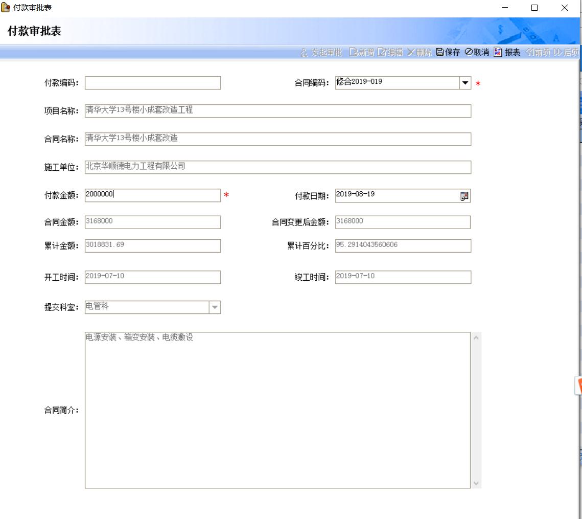 各科室输入合同付?gu)Ƒ֮批表Q发起审Ҏ(gu)E。付?gu)Ƒ֮批表包括目名称、合同名U、施工单位、篏计付?gu)N额等信息Q审批完成后生效?/p>