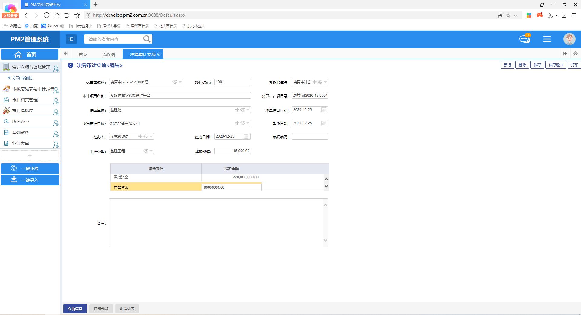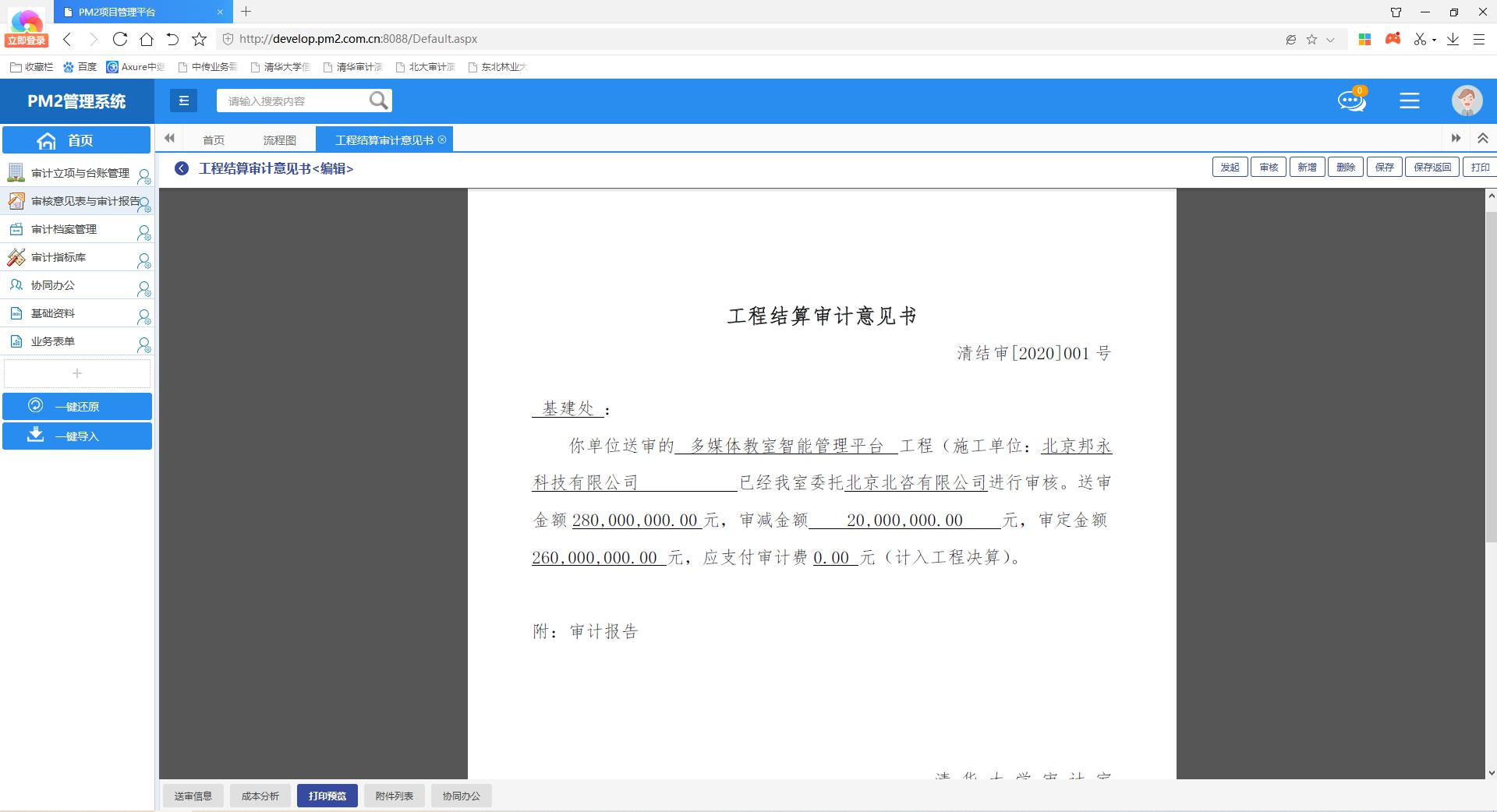 邦永PM2高校审计目理软g不仅实现?jin)工E概审计、工E结审计、全q程跟踪审计、工E决审计全程U上办理Q包括上q四业务的送审登记表、审计委托(sh)、审核意见表、审计意见书的在U填写和自动生成Qƈ能按工程、修~工E等不同目cd建立各种指标数据库,便于后箋(hu)跟踪审计工作的g伸?/p>