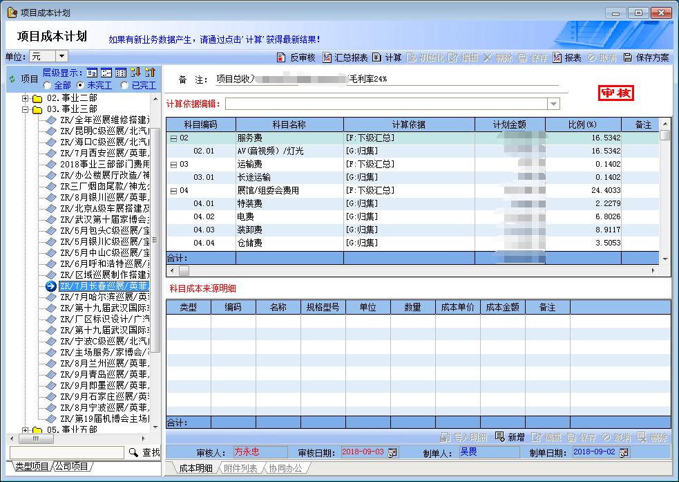 (4)所有項(xiàng)目的成本計(jì)劃數(shù)據(jù)通過項(xiàng)目費(fèi)用計(jì)劃取數(shù),系統(tǒng)自動(dòng)計(jì)算項(xiàng)目成本計(jì)劃數(shù)據(jù)。