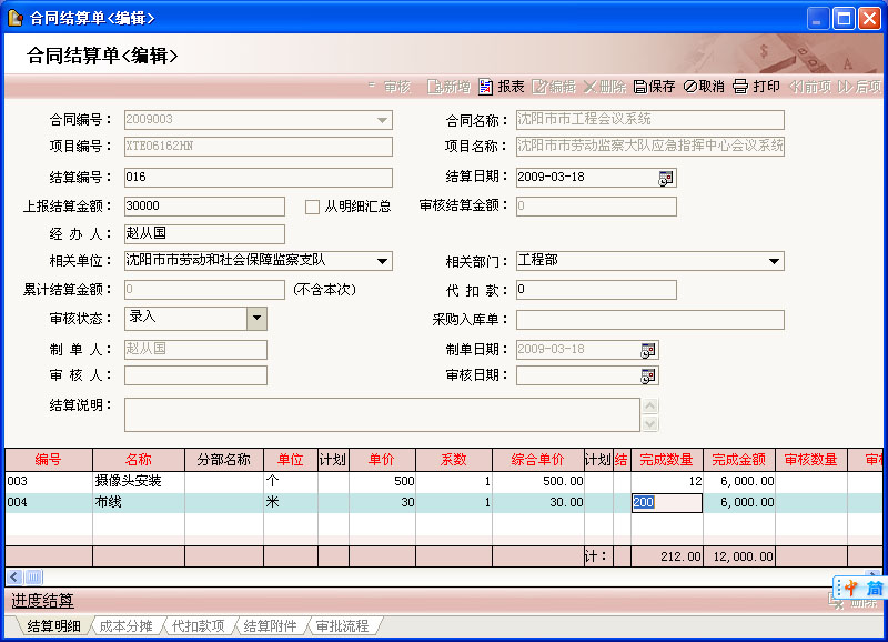 過程控制:進度上報,合同的簽訂、撥付、變更、簽證;