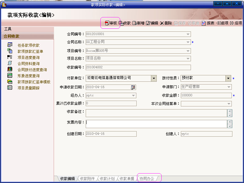 (2)合同管理模塊應(yīng)用:管理本部門牽頭簽署的各種合同及合同的執(zhí)行、款項申請等。