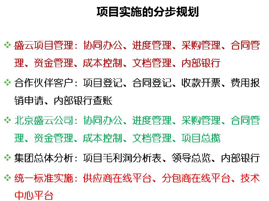 ◆    統(tǒng)一項目管理信息化標(biāo)準(zhǔn)體系,統(tǒng)一的流程、標(biāo)準(zhǔn)、規(guī)則和內(nèi)控標(biāo)準(zhǔn),數(shù)據(jù)集中管理;