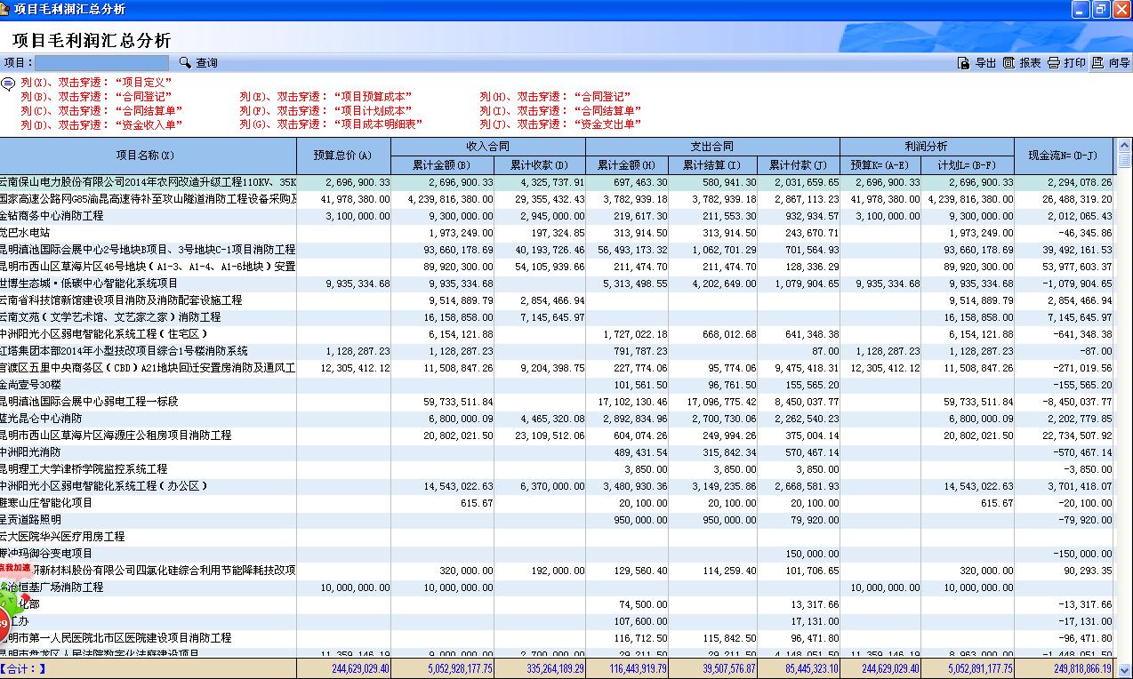 2)盛云項目毛利潤匯總分析:這是一個可進(jìn)行穿透功能的綜合項目成本統(tǒng)計分析表,是各位老總們對項目進(jìn)行審查、管理的、重要的項目經(jīng)營的情況統(tǒng)計分析表。