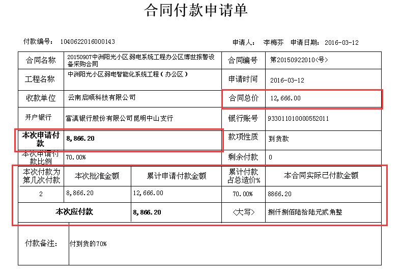 5)采購合同付款申請:增加“累計申請付款金額”和“本合同實際已付款金額”等字段,使該表更具實際意義。