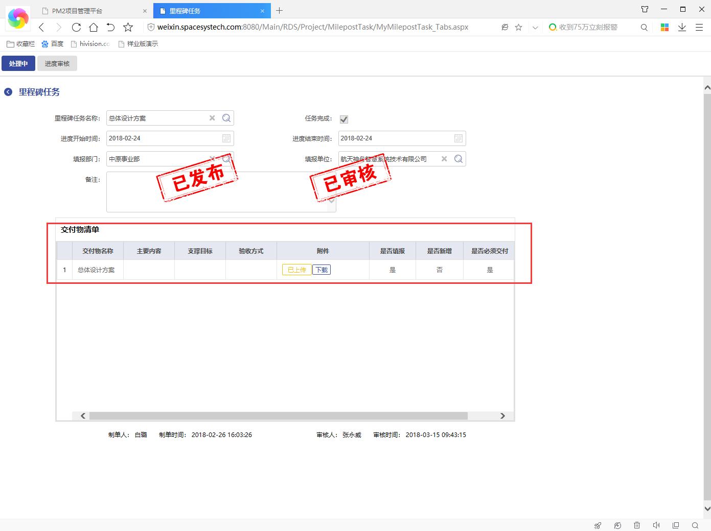 項目進(jìn)度管理面向管理層有宏觀的里程碑進(jìn)度分析,面向執(zhí)行層有可執(zhí)行的最小工作包,兼具不同角色需求產(chǎn)生不同的項目進(jìn)度分析結(jié)果。每一個里程碑、任務(wù)都可以設(shè)置一個或多個交付成果,當(dāng)交付成果為必須上傳時,里程碑、任務(wù)上報時必須上傳否則無法上報。