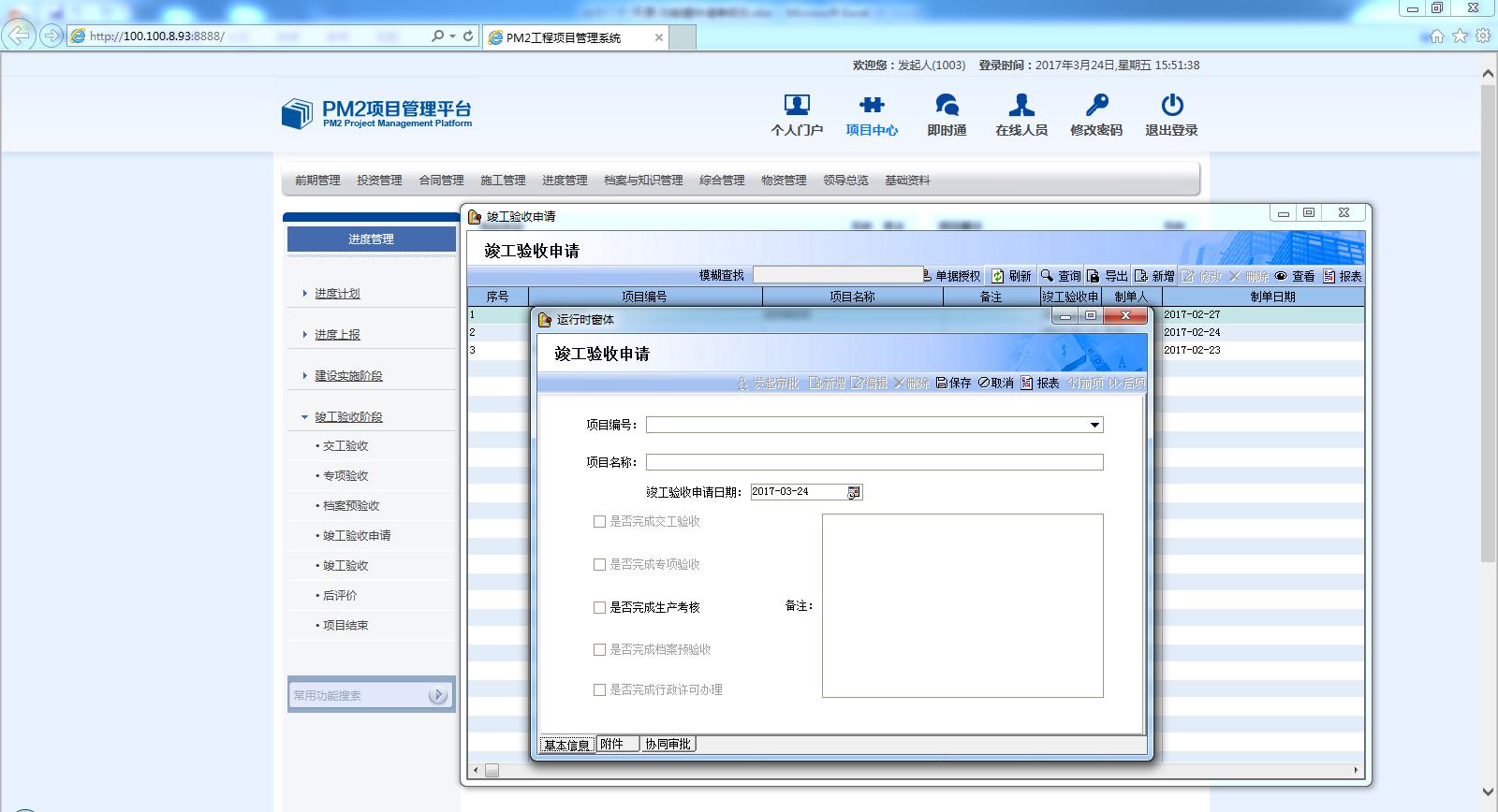 【竣工驗(yàn)收管理】本模塊用于管理項(xiàng)目竣工驗(yàn)收階段。功能包括:交工驗(yàn)收、專項(xiàng)驗(yàn)收、檔案預(yù)驗(yàn)收、竣工驗(yàn)收申請(qǐng)、竣工驗(yàn)收、后評(píng)價(jià)、項(xiàng)目結(jié)束。